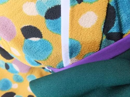 愛知県W.A様 ご注文品(着物風カバーオール)≪絣水玉(からし)ちりめん(生地持込)×深緑≫