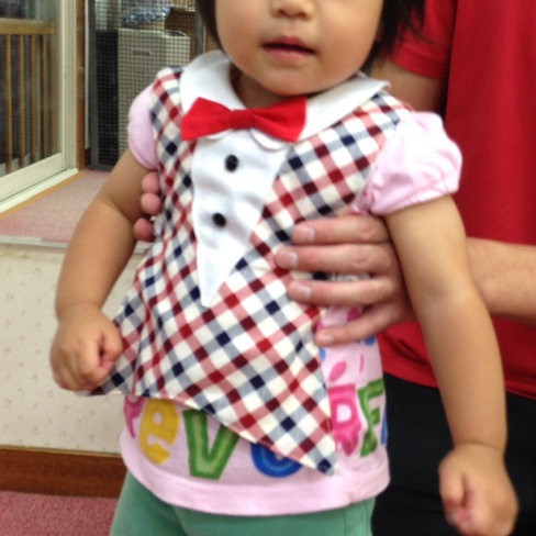 襟・シャツ・蝶ネクタイがすべてくっついたタキシード風スタイです。