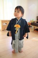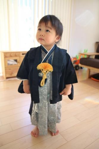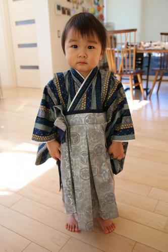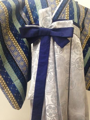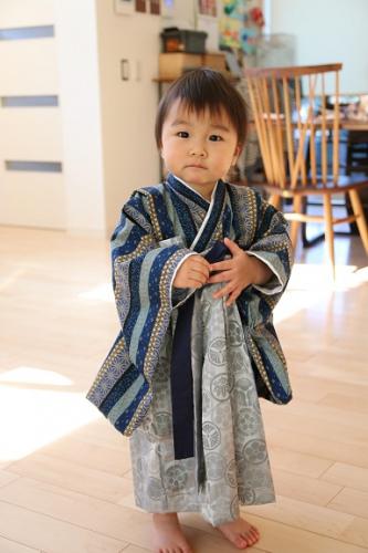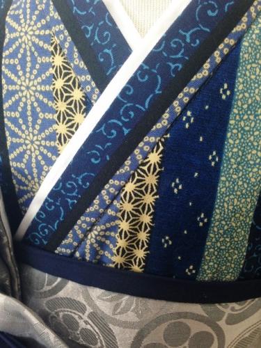 高知県M.M様 ご注文商品(着物風カバーオール)≪小紋縦縞柄(青)×綸子・家紋柄≫