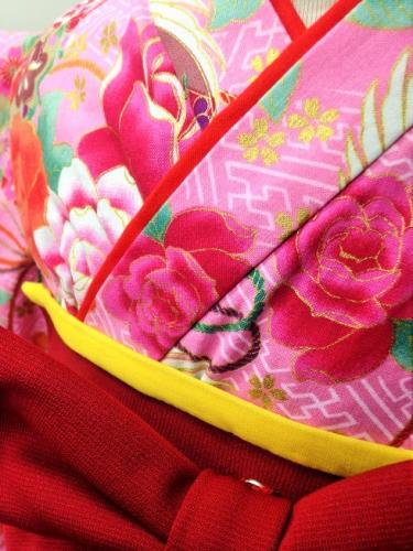 沖縄県S.Y様 ご注文品(着物風カバーオール)≪紗綾型に花模様(ピンク)×エンジ≫