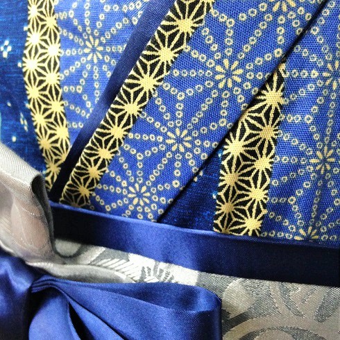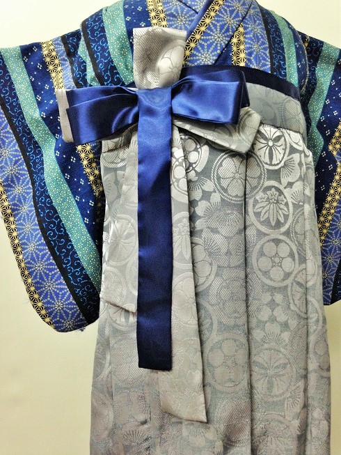 鹿児島県M.M様 ご注文商品(着物風カバーオール)≪小紋縦縞柄(青)×綸子・家紋柄≫