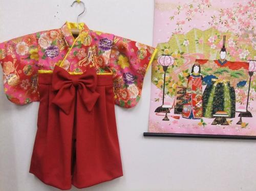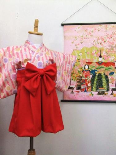 大阪府K様 ご注文商品(着物風カバーオール)≪矢絣ピンク金入り×赤≫
